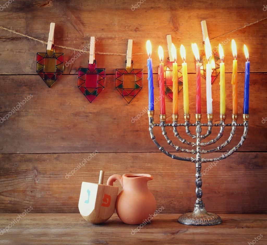 Low key image of jewish holiday Hanukkah with menorah (traditional Candelabra) and wooden dreidels (spinning top).