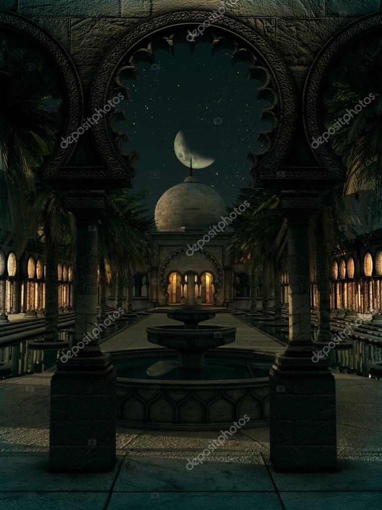 COMPUTER BACKGROUND ILLUSTRATION ART PALM ENVIRONMENT GARDEN WATER LIGHT TREE 3D GRAPHICS STAR FANTASY ARCHITECTURE BUILDING NIGHT ROMANTIC TRADITIONAL STAIRS MAGIC PALACE ATMOSPHERE MOON CUPOLA DOME ARCH LIGHTING COLUMN ORIENTAL MAGICAL ISLAM ORIENT FOUNTAIN PILLAR PATIO PAVILION ARABIAN ARCHWAY AMBIANCE ARABIA CRESCENT MIDDLE EAST HALF MOON INNER COURTYARD