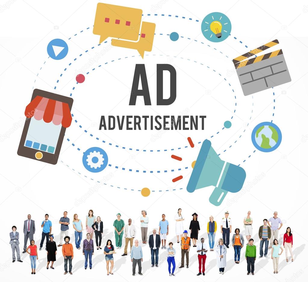 Group of Diversity People and Graphic Concept with text: ad advertisement