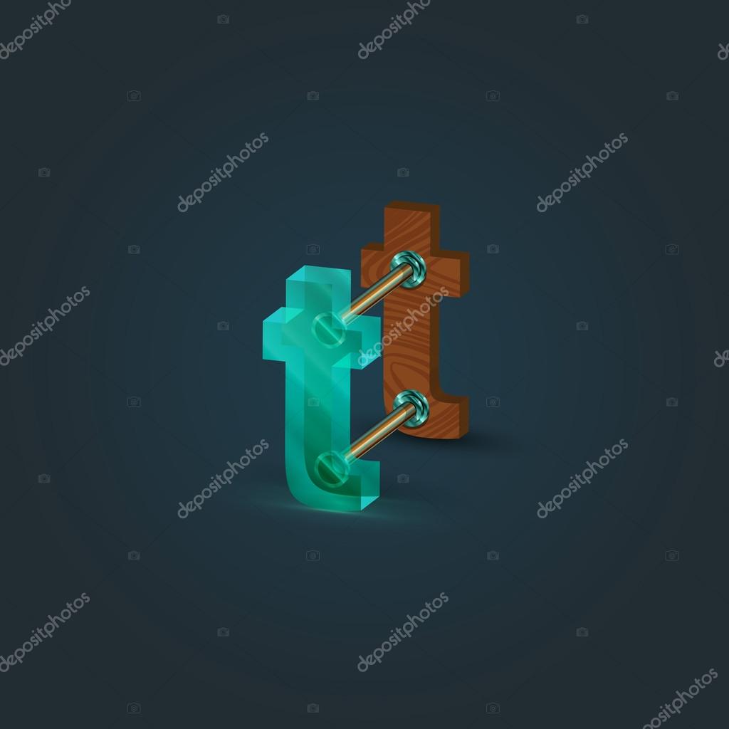Design green and wooden small letter t with 3D elements, vector illustration
