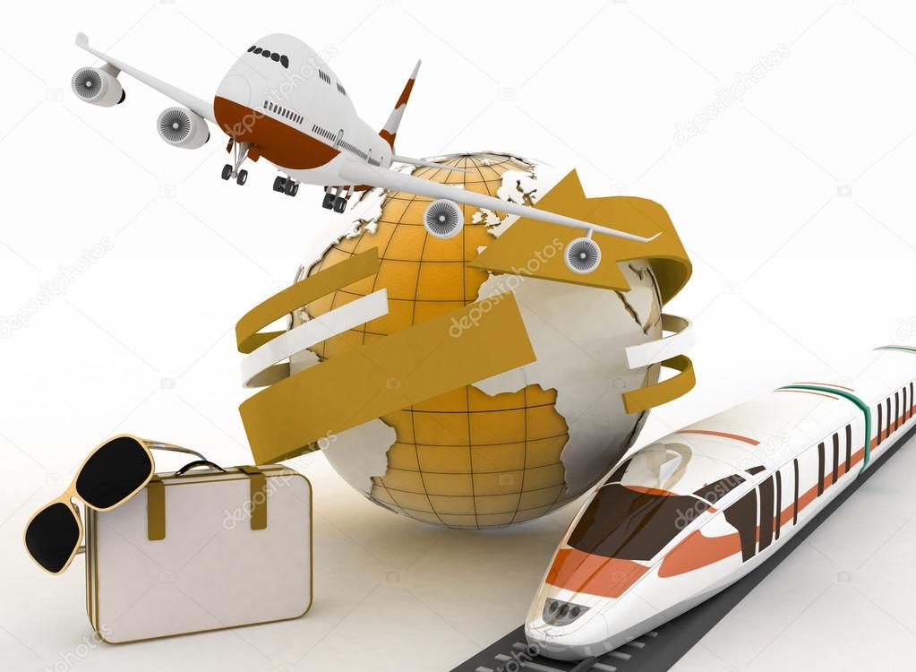 - 3d чемодан, самолет, поезд и глобус. Концепция путешествия и отдыха .