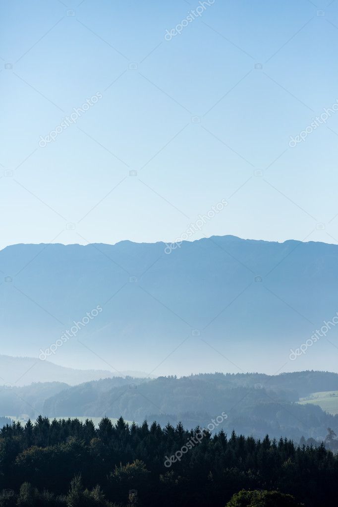 - Вид на холмы с восходящим туманом