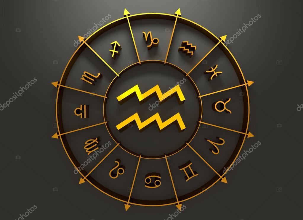 Знак астрологии носителя воды. Золотой астрологический символ в кругу других поет. 3D рендеринг