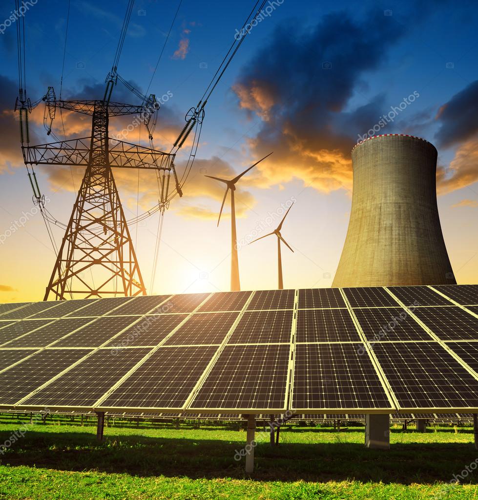 Солнечные батареи на заднем плане атомной электростанции, ветряные турбины и электрический столб на закате. Концепция энергоресурсов