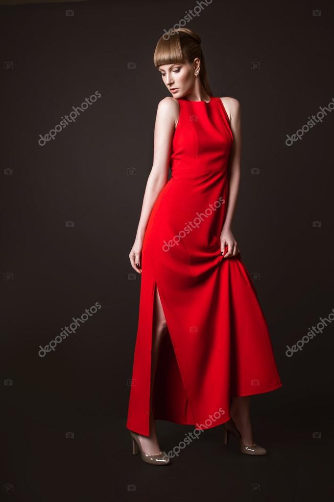 Красивая женщина модель позирует в простом элегантном красном платье в студии на черном фоне