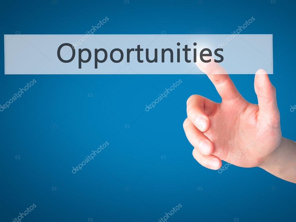 Возможности - Ручное нажатие кнопки на размытом фоне концепции. Бизнес, технологии, интернет концепция. Фондовое фото