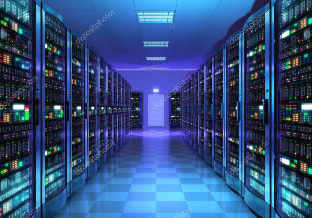 Современные веб-сети и интернет телекоммуникационных технологий, хранения больших данных и облачных вычислений компьютерных услуг бизнес-концепция: серверная комната интерьера в центре обработки данных в синем свете