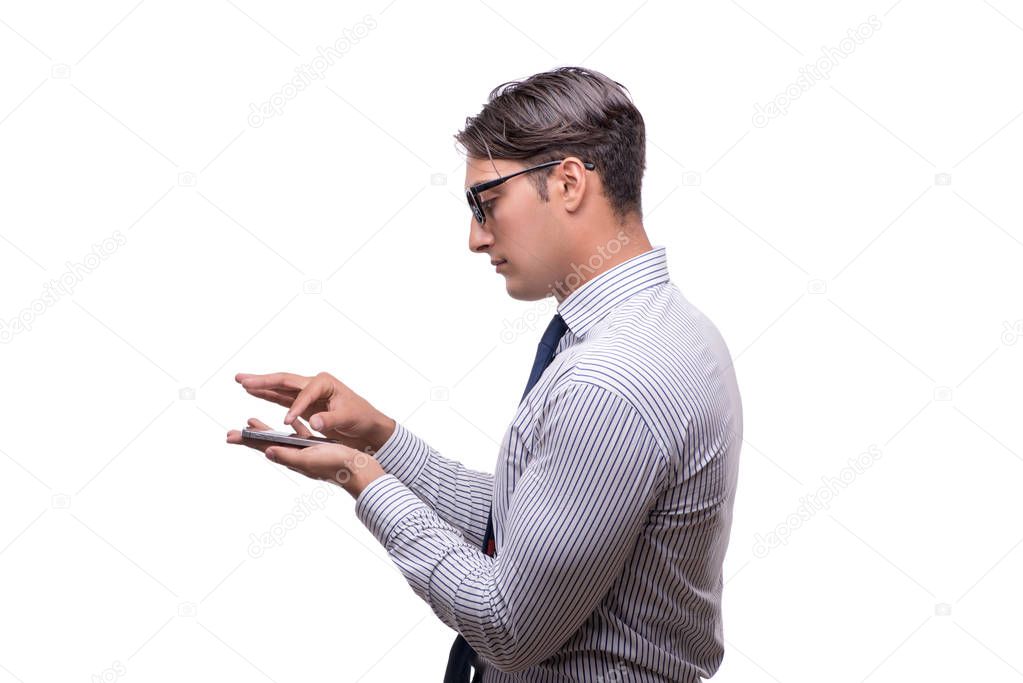Красивый бизнесмен работает с мобильным телефоном изолирован на белом
