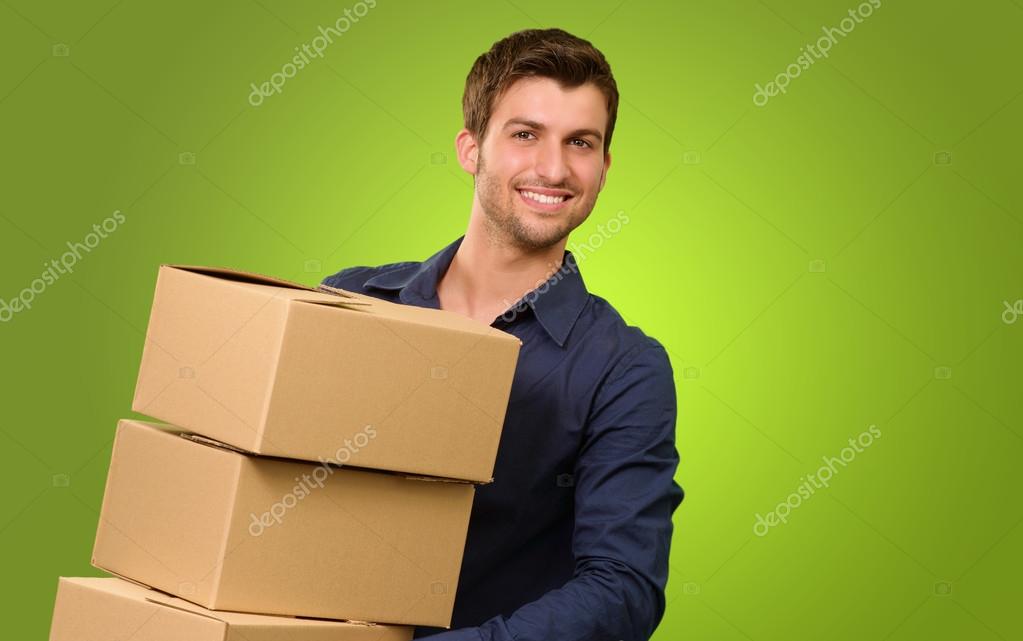 Молодой человек держит стопку картонных коробок на зеленом фоне