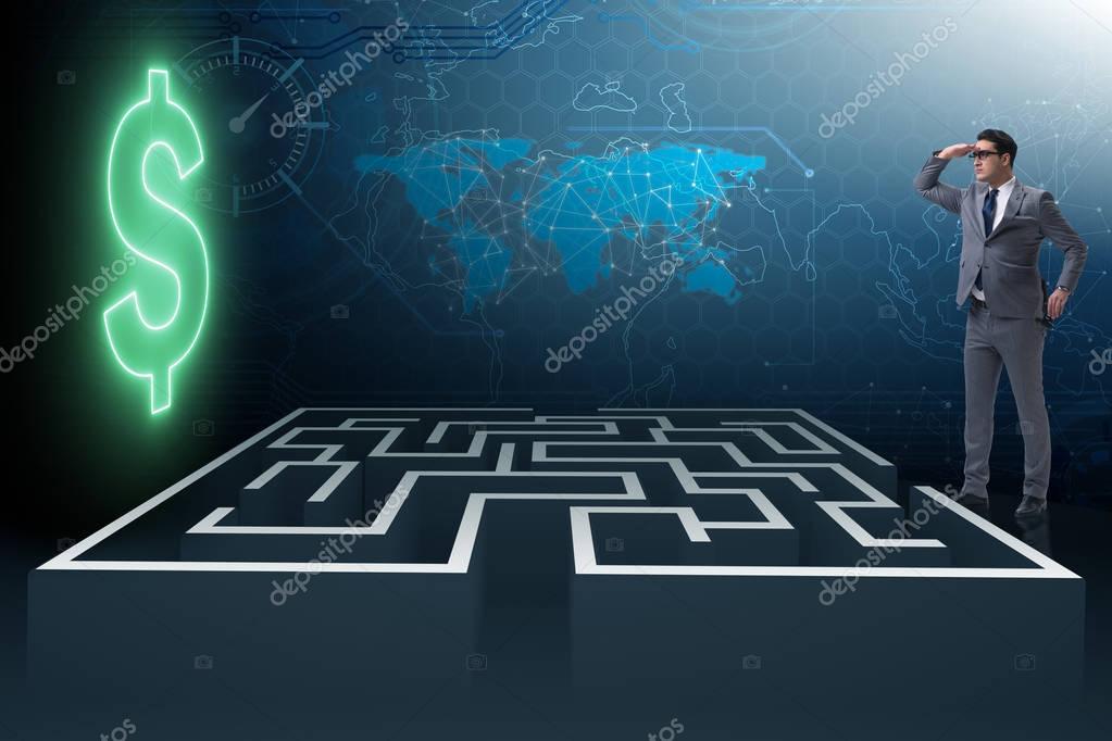 Человек пытается добраться до долларов через лабиринт