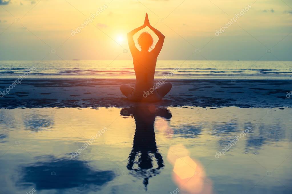 Силуэт молодой женщины, практикующей йогу на пляже, на закате