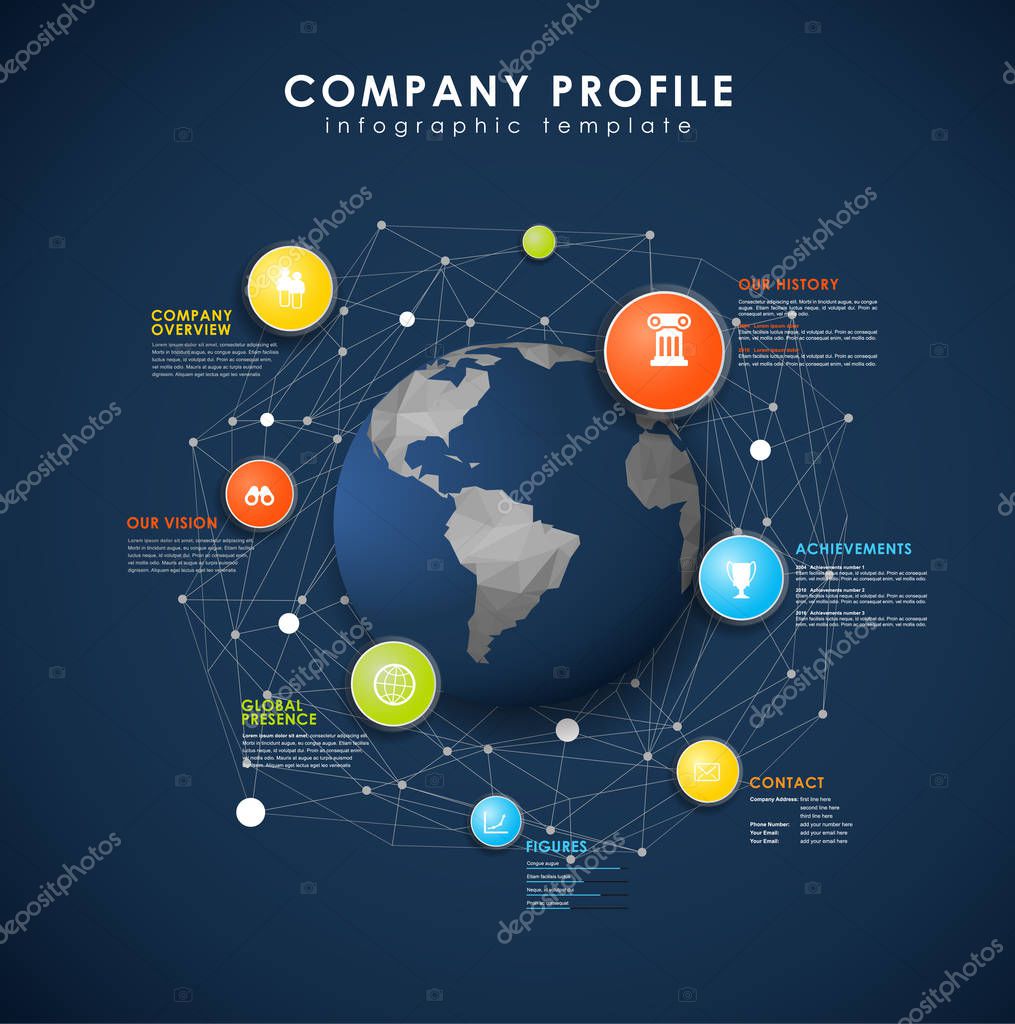 Обзор профиля компании шаблон с красочными кругами, точками и полигональным глобусом - темная версия