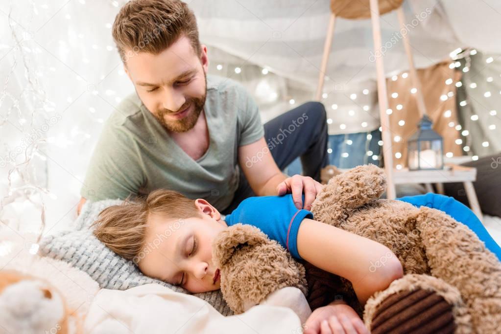 Улыбающийся отец смотрит на милого маленького сына, спящего с плюшевым мишкой