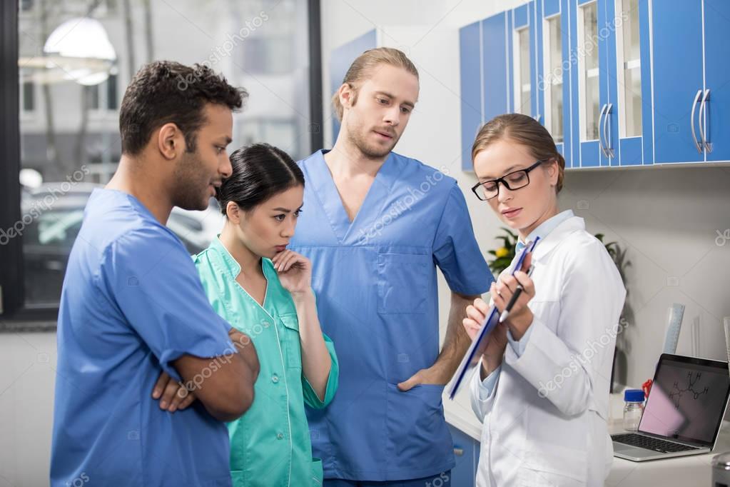 Группа коллег обсуждает работу в лаборатории