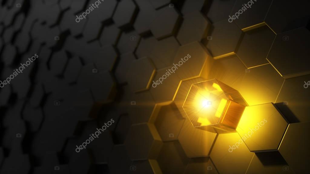 3d иллюстрация шестиугольной покрытой стеной. случайные повышенные шестиугольники и выбран один с источником света. Золотой свет