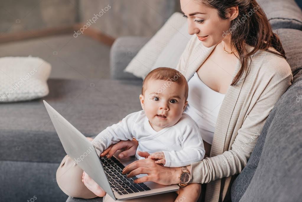 Молодая мать со своим очаровательным сыном использует ноутбук вместе на диване. Концепция семейной жизни