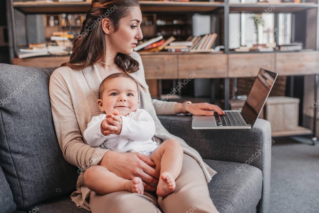 Молодая мать сидит на диване со своим сыном и использует ноутбук дома