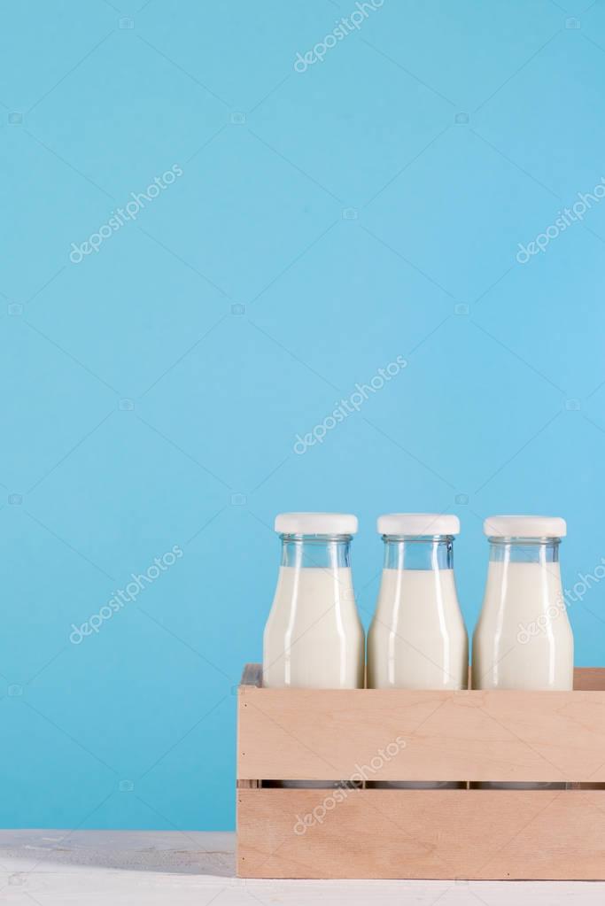 Стеклянные бутылки с молоком в деревянной коробке на столе на синем фоне