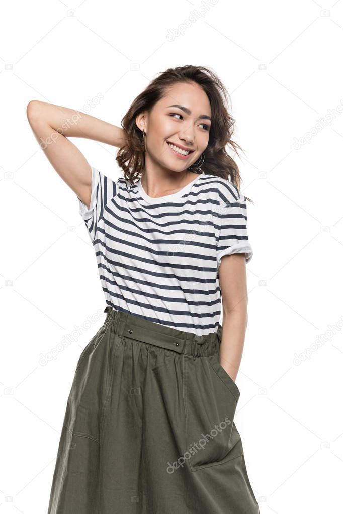 КРАСИВАЯ СЧАСТЛИВЫЙ ЛИЦО ДЕВУШКА МОЛОДЫЕ СМОЛИНГ ВЗРОСЛЫЙ ЛЮДИ КРАСОТА МОДЕЛЬ СЧАСТЬЕ ВЕСЕЛЫЕ УЛЫБКА БРЮНЕТКА СТИЛЬ МОДА ДОВОЛЬНО СТИЛЬНЫЙ ЖЕНЩИНА МОДНЫЕ ФАНАН В ОДИНОЧКУ ПРИВЛЕКАТЕЛЬНОСТЬ КАЗУАЛЬ ЮБКА ПОЗИЦИЯ МОДНО ХИПСТЕР ИЗОЛИРОВАННЫЕ НА БЕЛОМ СНИМОК СТУДИИ ОТВОДЯ ВЗГЛЯД РУКА В КАРМАНЕ РУКА ЗА ГОЛОВОЙ