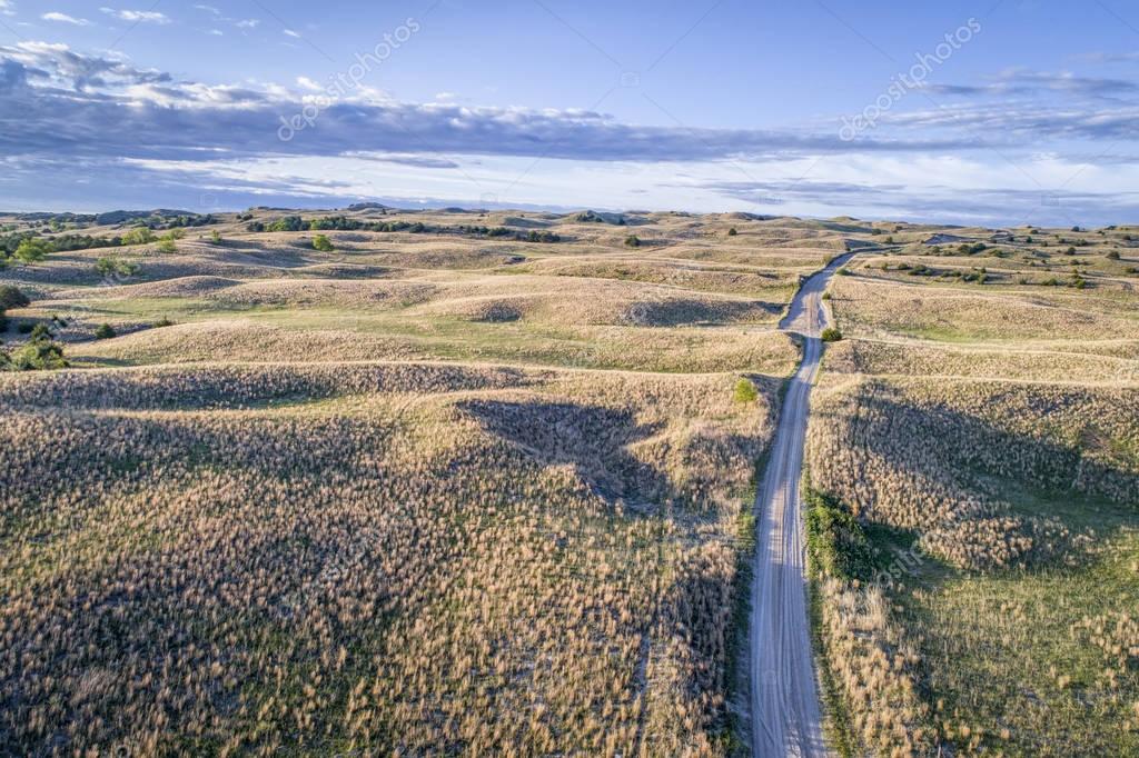 Вид с воздуха на песчаную дорогу в Небраске Sandhills около Сенеки, весенний пейзаж с утренним освещением