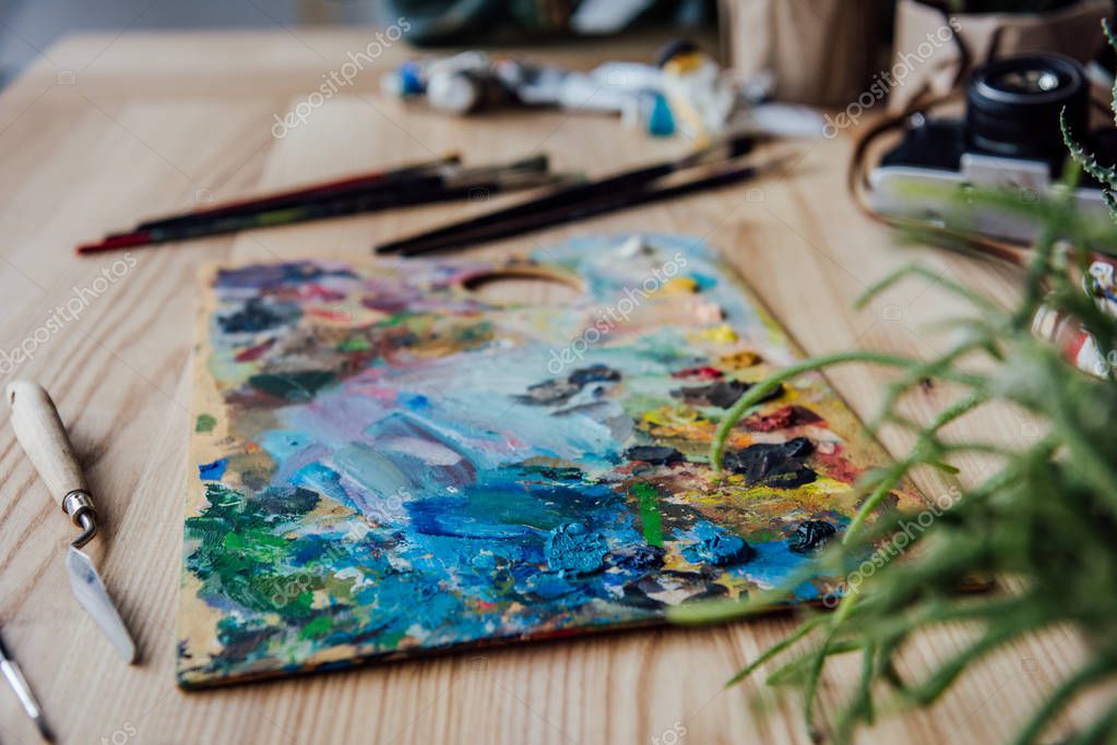 Творческое рабочее место с художественными принадлежностями, старинной камерой и горшечными заводами