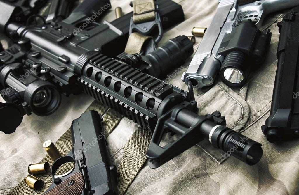 Оружие и военная техника для армии, штурмовая винтовка (M4A1) и пистолет на камуфляжном фоне
