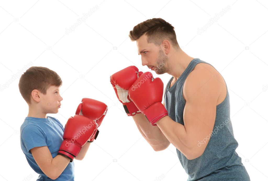 Папа и сын в боксёрских перчатках на белом фоне