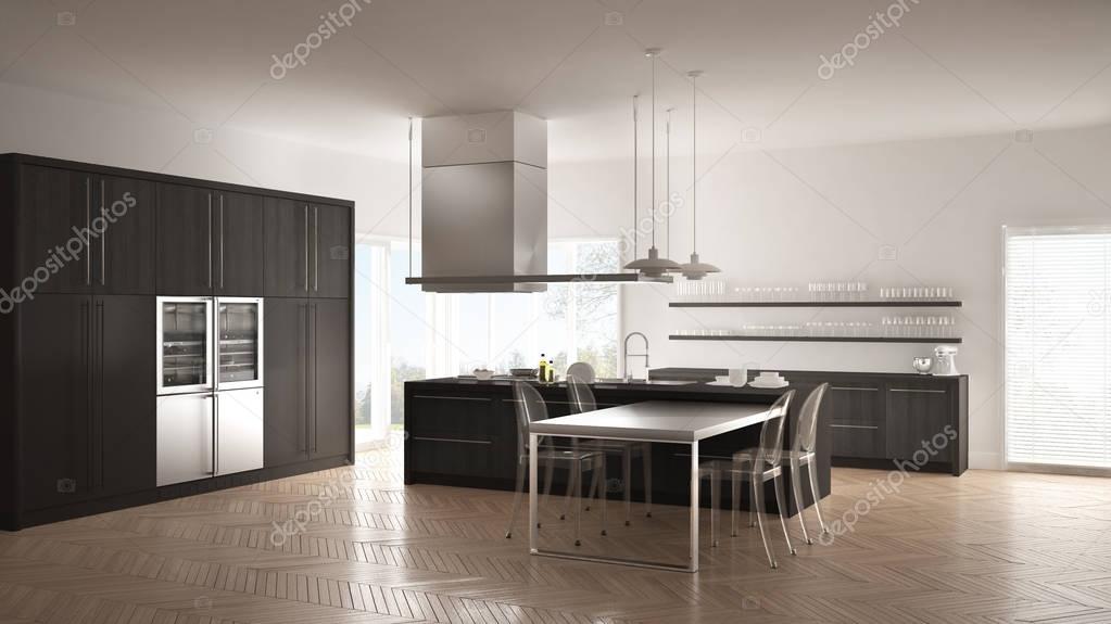 Минималистичная современная кухня со столом, стульями и паркетным полом