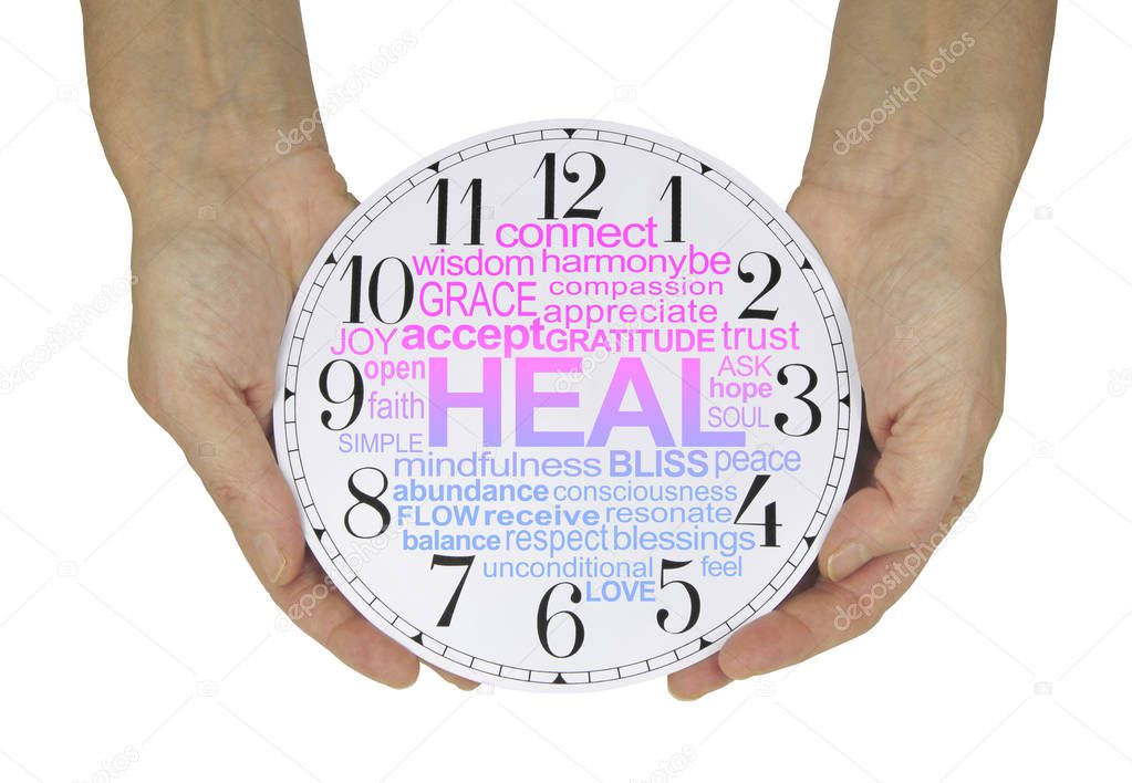 Руки женщины держат циферблат, содержащий розовый и синий окончил ЗДОРОВЬЕ слово облако изолированы на белом фоне
