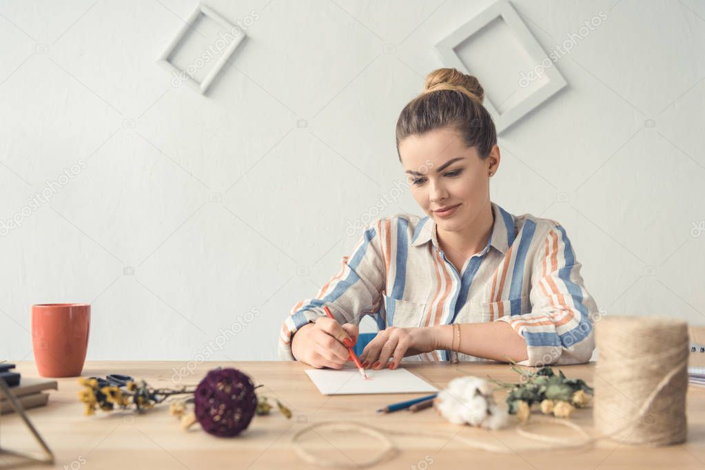 Привлекательная женщина-декоратор пишет что-то, сидя за столом с сухими цветами