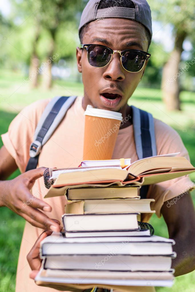 Молодой африканский американец в кепке и солнцезащитных очках держа в руках кучу книг с бумажной чашкой