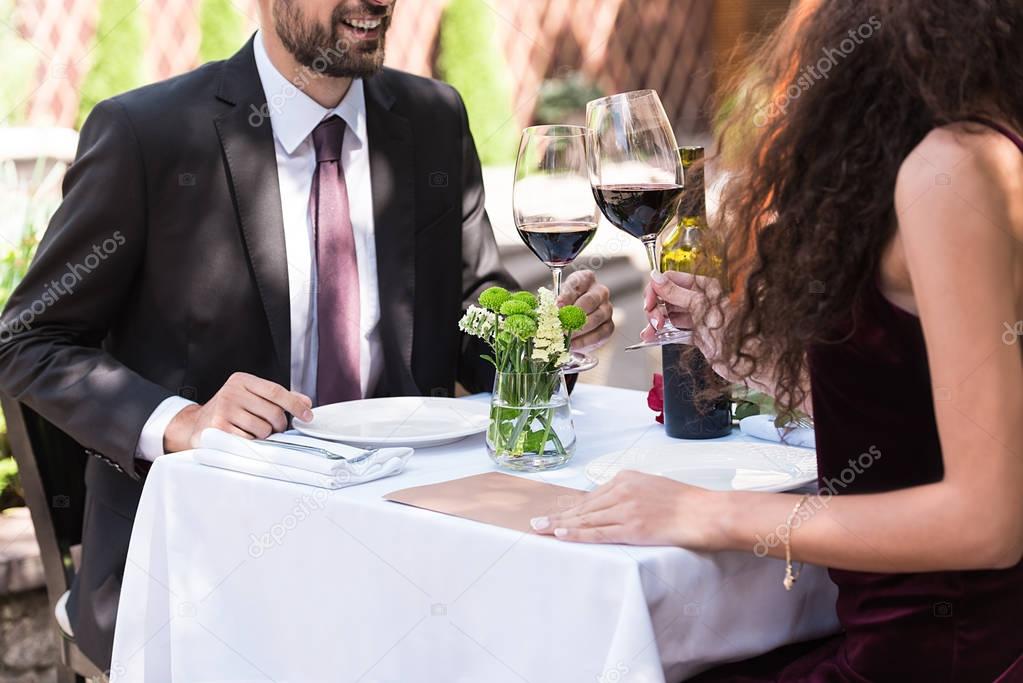 Пара с романтическим свиданием, сидящая за столом в ресторане и звонящие очки
