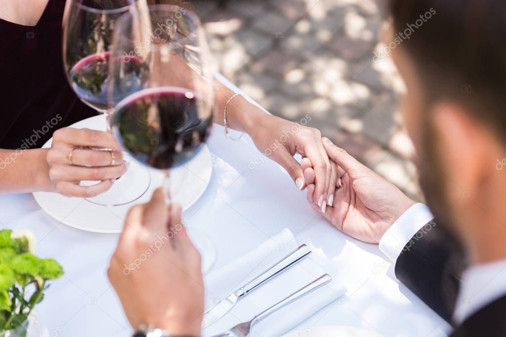 Пара, встречающаяся в ресторане, держащаяся за руки и звонящие очки