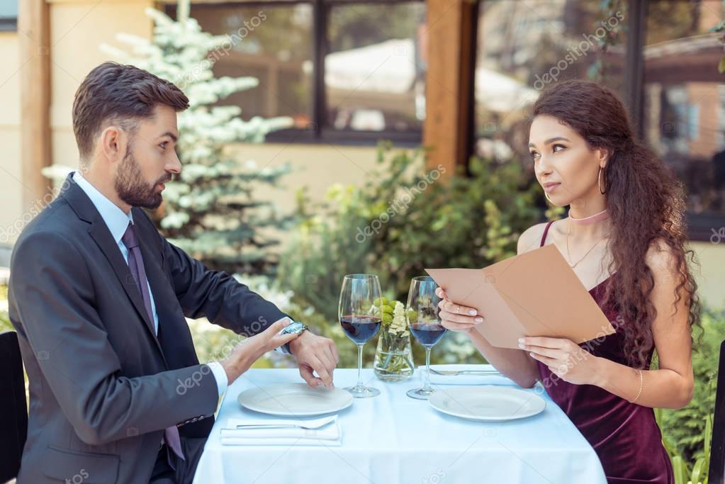 У пары романтическое свидание в ресторане, женщина выбирает еду в меню, мужчина смотрит на часы