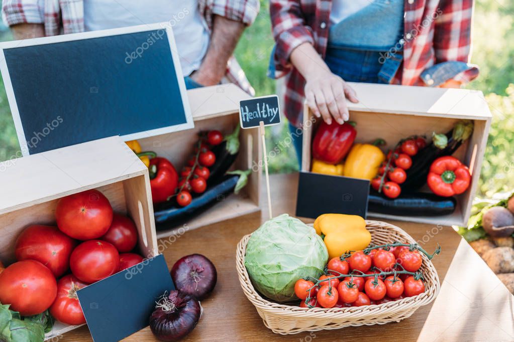 Обрезанный снимок фермеров, продающих свежие органические овощи на рынке