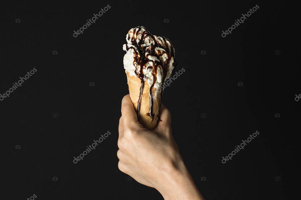 Обрезанный вид на руку с ванильным мороженым в конусе с шоколадной начинкой, изолированный на черном