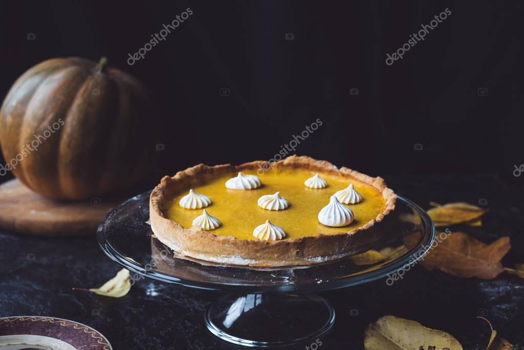 Состав с тыквенным пирогом на стеклянном торте, осенние листья и тыква на заднем плане