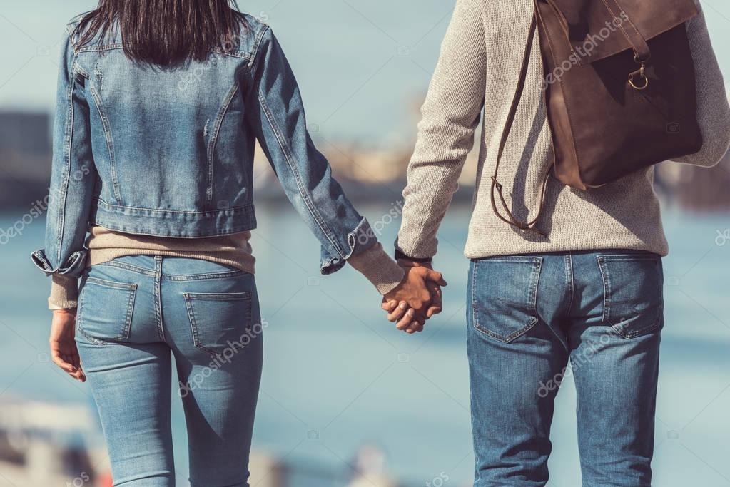 Назад вид молодой пары, держащейся за руки на берегу реки
