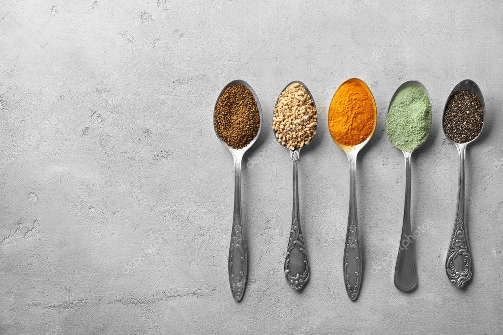 Состав с ассортиментом суперпродуктов в ложках на сером текстурированном фоне, вид сверху