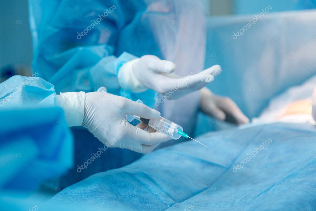 Наполни его. Уверенные в себе медицинские работники в стерильных резиновых перчатках и стоя рядом с пациентом во время инъекции