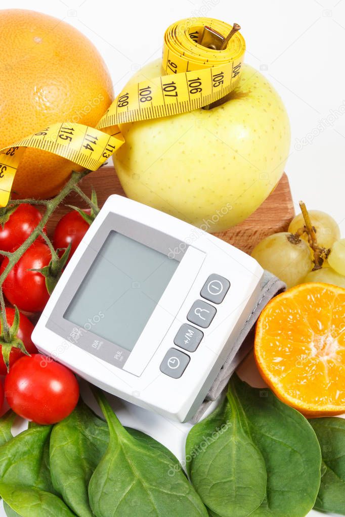 Монитор артериального давления, свежие фрукты с овощами и скотчем, здоровый образ жизни, похудение и профилактика гипертонии