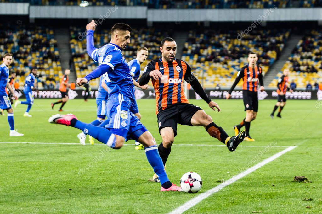 Киев, Украина - 22 октября 2017 года: Евгений Хачериди в действии против исмаилийцев. Матч Премьер-лиги Украины "Динамо" Киев - "Шахтер" Донецк на стадионе "Олимпийский"