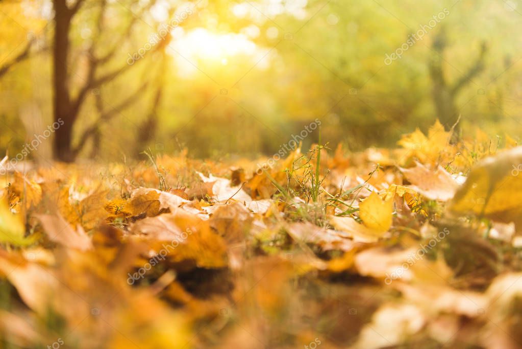 Крупным планом снимок опавших листьев клена в осеннем парке