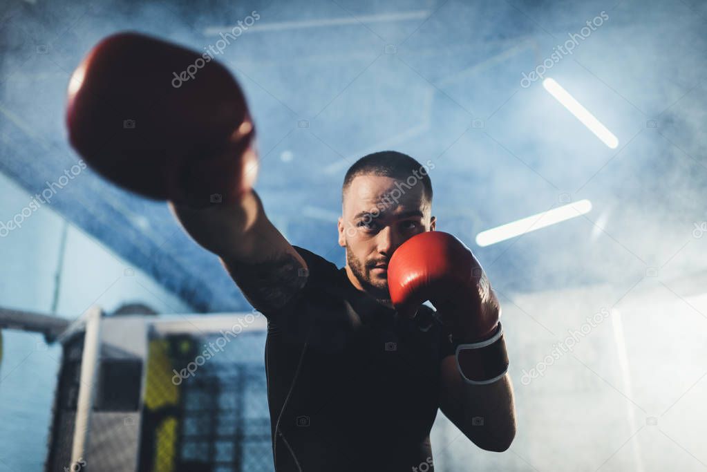 Ориентированный спортивный юноша в боксёрских перчатках тренируется в спортклубе