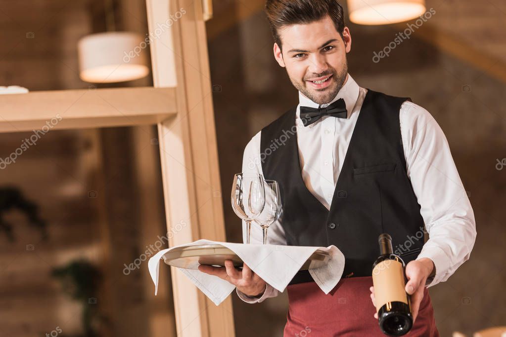 Улыбающийся официант с бокалами и бутылкой вина