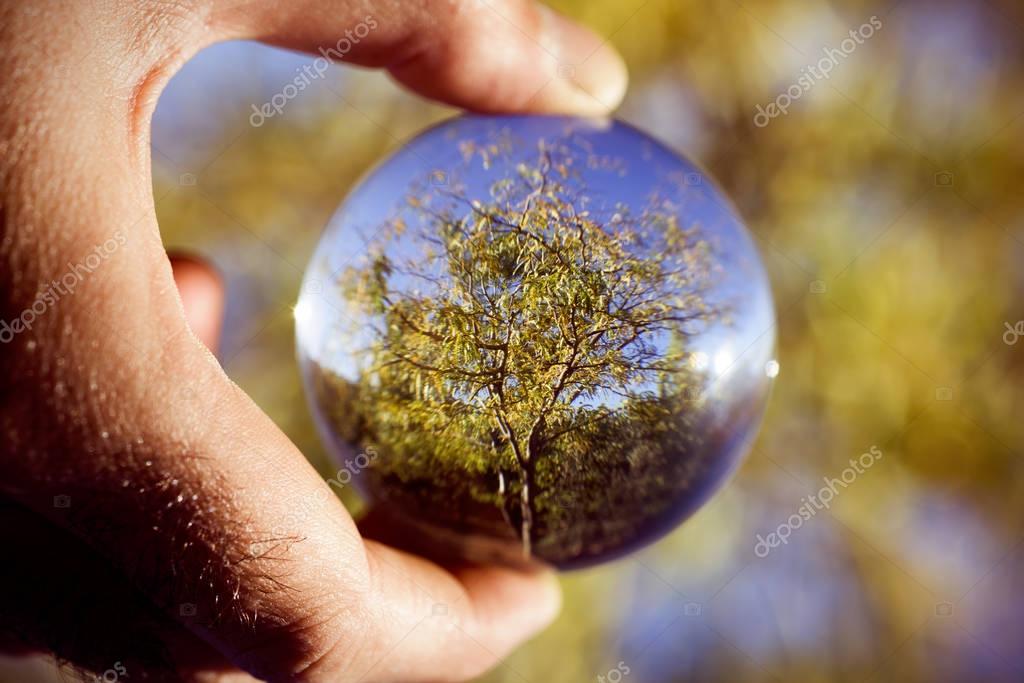 Крупный план руки молодого кавказца на улице, держащего хрустальный шар, где отражено дерево
