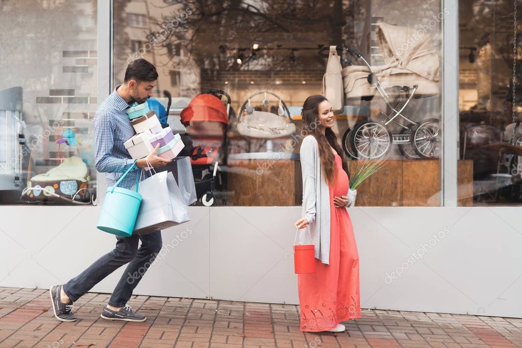 Беременная женщина с мужчиной, проходящим мимо витрины магазина с детским товаром .