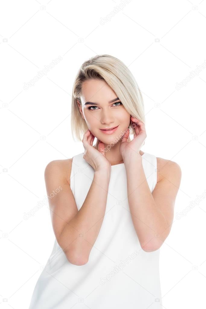 красивая улыбающаяся женщина, смотрящая в камеру, изолированная на белом