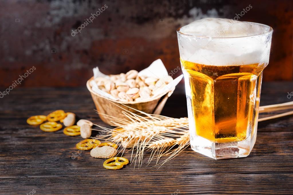 Стекло с пивом и головкой пены рядом с тарелкой с фисташками, пшеницей, разбросанными маленькими крендельками и арахисом на темном столе. Концепция продуктов питания и напитков