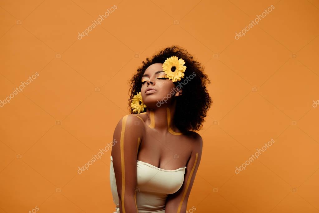 Молодая чувственная африканская американка с художественным макияжем и герберой в волосах, изолированных на оранжевом фоне